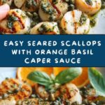 Once seared, remove the scallops from heat and let them rest for a minute. This little pause helps keep the scallops juicy. Then, spoon the vibrant orange, basil, and caper dressing generously over the top and get ready to dive into a plate full of fresh, bright flavors.