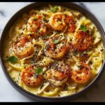 Pour the white wine or chicken broth into the skillet to deglaze, scraping up those garlic and shrimp bits—they’re full of flavor! Let it simmer gently for a few minutes to reduce slightly. Then stir in the heavy cream and Parmesan cheese to create that rich, velvety sauce. Give it a couple of minutes to thicken before moving on.