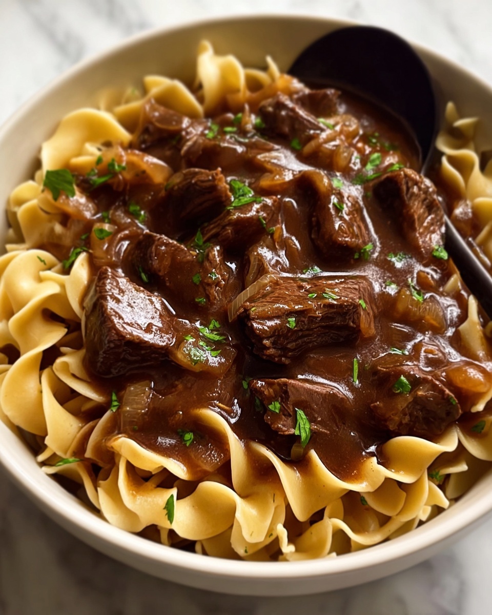 Finally, ladle the melt-in-your-mouth beef and rich gravy over the cooked egg noodles. Give the dish a gentle toss or serve the beef piled on top for a rustic presentation. This is the moment where all your patience pays off—every bite warmed by slow-cooked flavor and all the cozy comfort you crave.