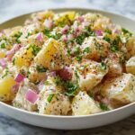 A delicious and easy-to-make Smashed Potato Salad featuring tender baby potatoes combined with tangy dill pickles, fresh herbs, and a creamy Dijon-mayo dressing. Perfect for a comforting side dish or a picnic favorite.