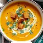 Garnishing this soup is a lovely way to add texture and an extra pop of flavor. Consider crispy croutons that offer a delightful crunch, fresh herbs like cilantro or parsley for brightness, or toasted pumpkin seeds to continue the autumnal vibe. Each garnish brings a little extra something that makes the bowl inviting and fun to eat.