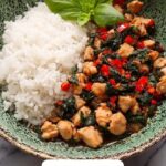 Spicy Thai Basil Chicken, also known as Pad Krapow Gai, is a vibrant and flavorful stir-fry featuring tender chicken thighs, fresh basil, and a savory-spicy sauce. This quick and easy Thai classic is perfect for a satisfying weeknight dinner, served hot over steaming rice.