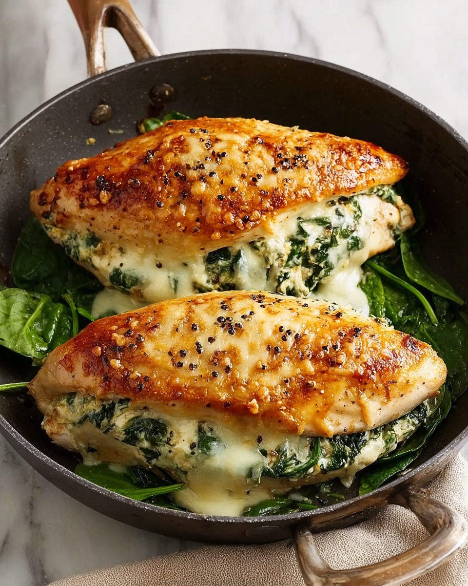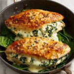 A delicious and creamy Spinach and Cheese Stuffed Chicken Breast recipe that features tender chicken breasts filled with a savory blend of fresh spinach, ricotta, mozzarella, and Parmesan cheeses, seasoned with garlic and Italian herbs. Perfectly seared to a golden brown and then baked to juicy perfection, this dish is great for a flavorful and satisfying weeknight dinner.