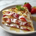 Delight in these Strawberry Cheesecake Quesadillas featuring a creamy, sweetened cream cheese filling paired with fresh, sugar-tossed strawberries, all grilled to golden perfection between warm flour tortillas. This easy-to-make American dessert offers a comforting and indulgent treat perfect for any occasion.