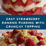 - Repeat Layers: Add the remaining banana pudding, followed by the remaining banana and strawberry slices, and finish with the remaining crunch topping.