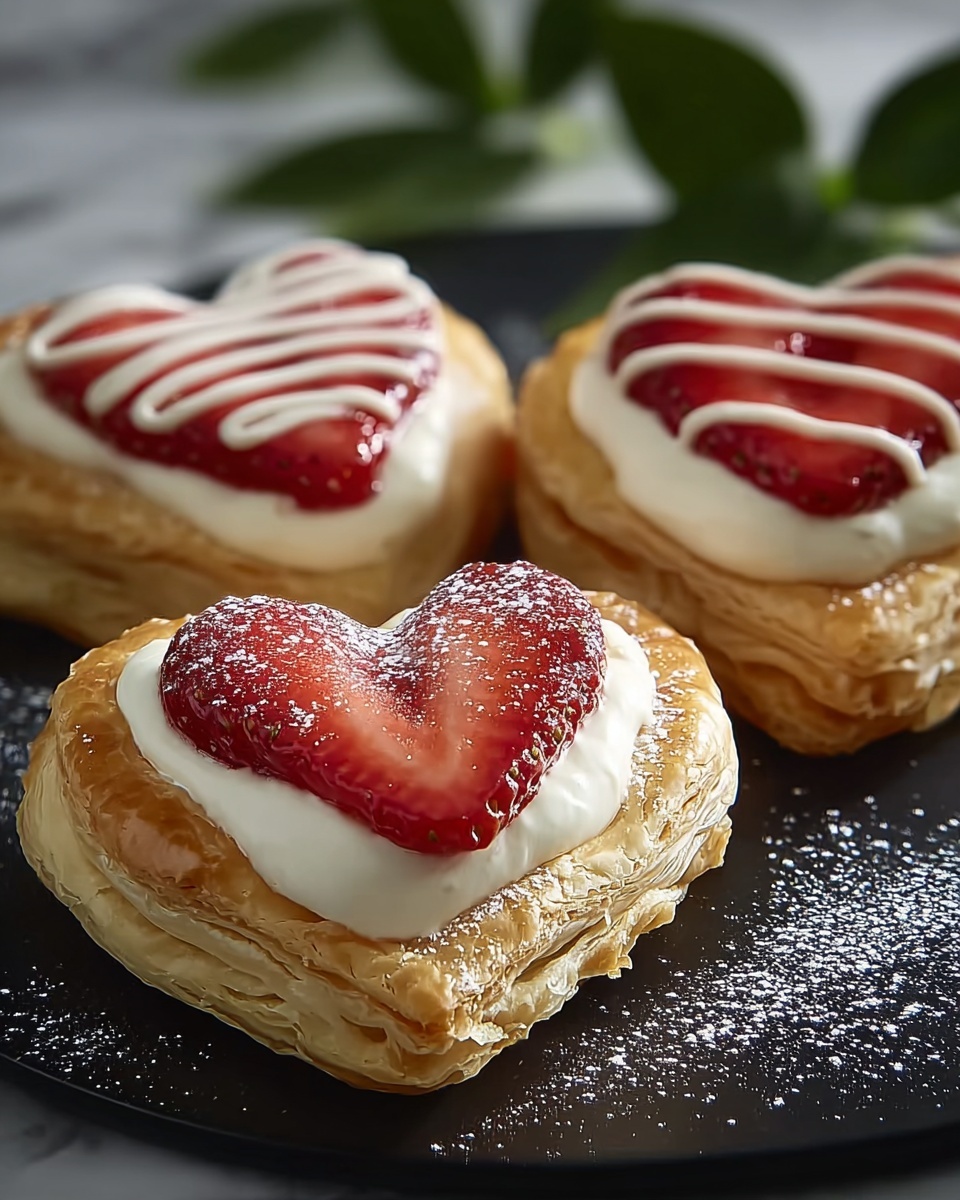 After removing from the oven, let the Strawberry Puff Pastry Hearts cool slightly. Then dust them with powdered sugar for that final, delicate touch that looks like a sweet kiss of snow on each pastry heart.