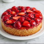 A delightful and visually stunning Strawberry Upside-Down Cake featuring a sweet, juicy layer of caramelized strawberries atop a moist white or yellow cake base, enhanced with vanilla and lemon zest for extra flavor. This classic dessert is perfect for showcasing fresh strawberries and makes an impressive centerpiece with its glossy fruit topping.