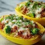For an elegant twist, serve the Stuffed Spaghetti Squash with Ground Beef, Broccoli, and Mozzarella Recipe on individual plates with a drizzle of balsamic glaze. Or create a family-style presentation by placing the stuffed halves on a large platter garnished with fresh herbs and lemon wedges. It’s both rustic and inviting, perfect for sharing.