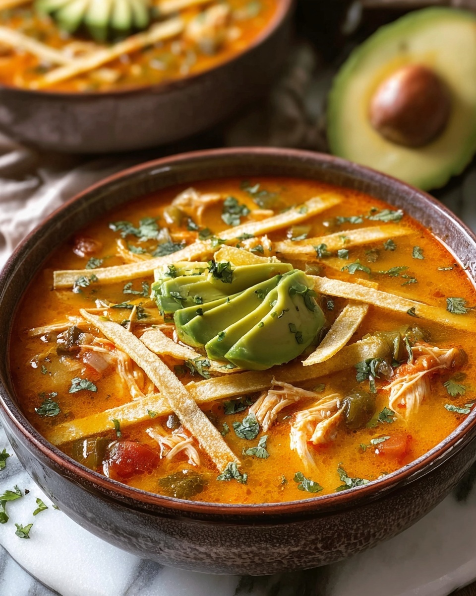 - Serve: Ladle the hot soup into bowls. Top with crispy tortilla strips and your favorite optional toppings such as diced avocado, crumbled queso fresco, sour cream, chopped cilantro, green onions, and lime wedges for added freshness and texture.